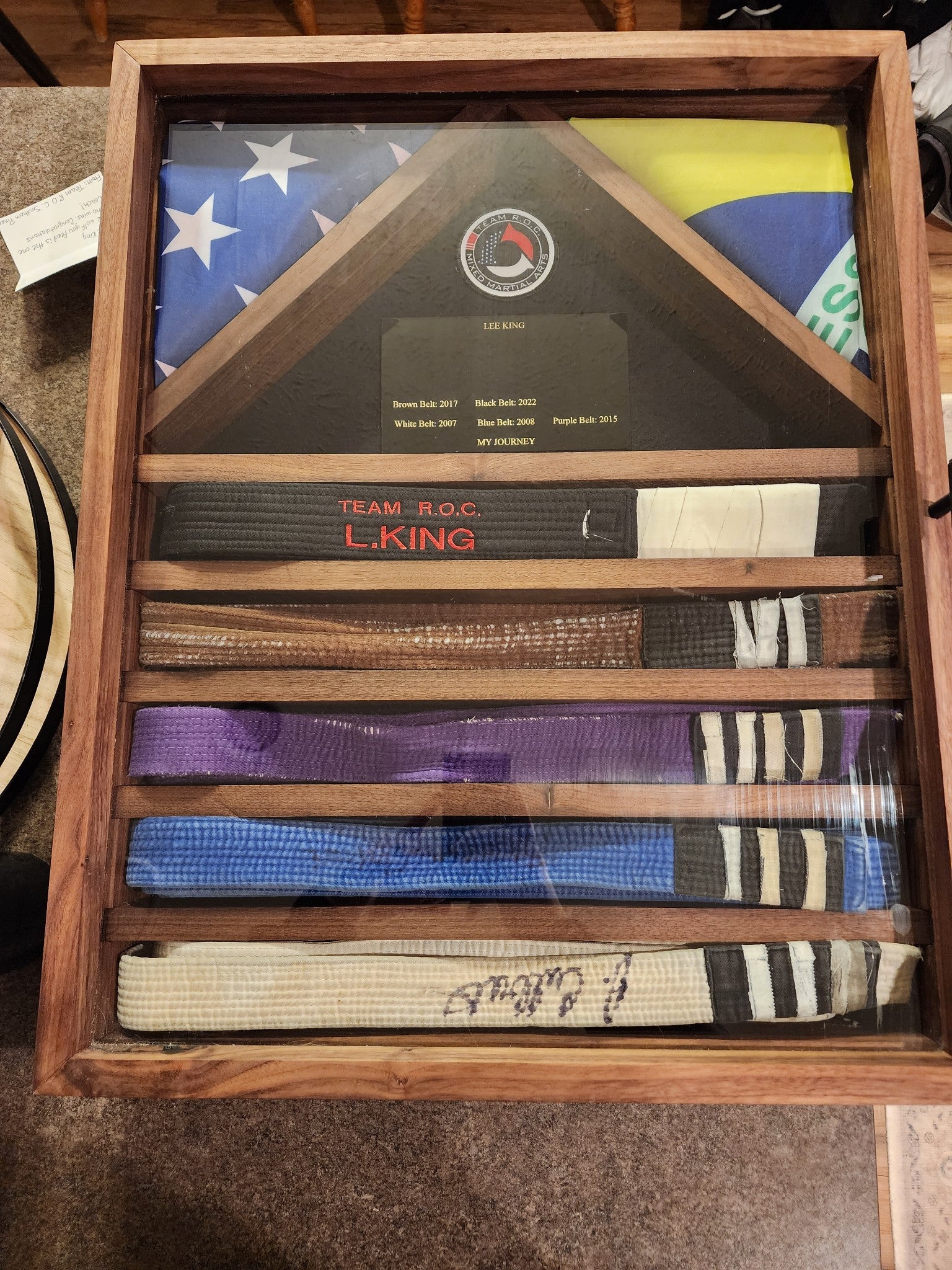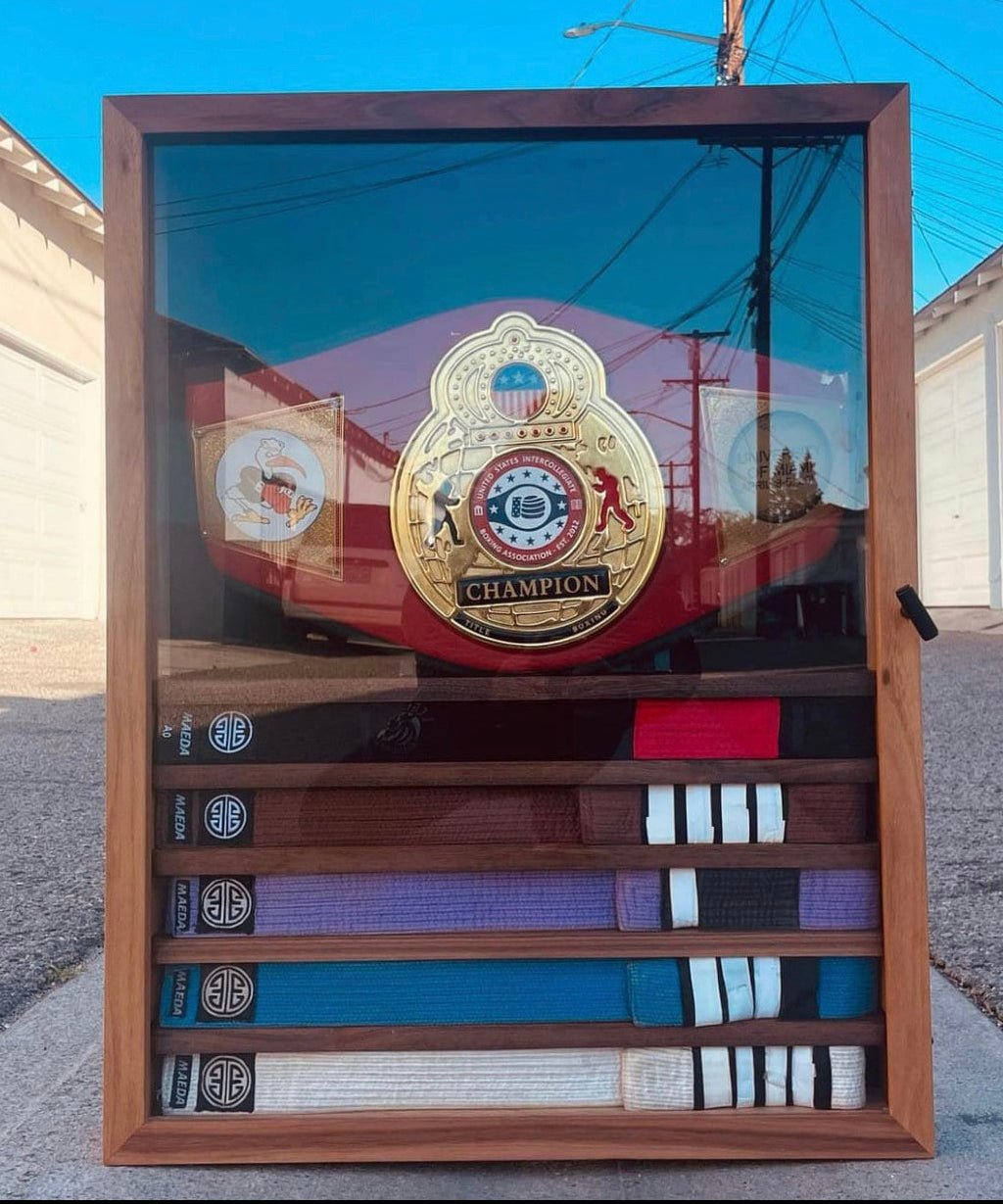 Display case for your well-earned martial arts belts. Whether you achieved success in Brazilian Jiu Jitsu, Tae Kwon Do, etc., you deserve to display your achievements.